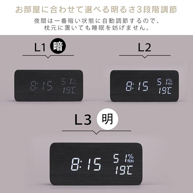 モード機能:時刻:〇/温度:〇/湿度:〇/日付:〇/アラーム:〇(3種類+土日オフ)/明るさ調節:3段階/省電力:〇/マイクロUSB電源のみ(ACアダプター)
