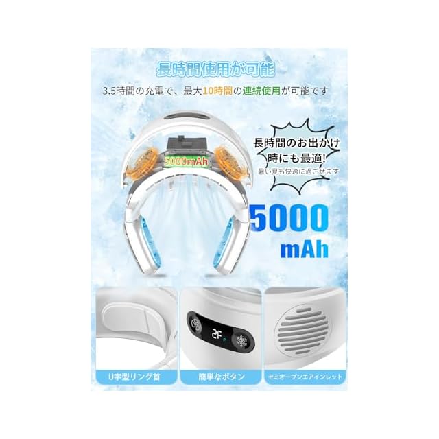 【長時間連続稼働】このネッククーラーには5000mAhのリチウムイオンバッテリーが内蔵されており、Type-Cで充電できます。充電には約3時間かかり、最大10時間連続使用できます。充電しながらパソコン、車載USB充電器、携帯電話バッテリー使用可能、外出時や充電がある場所でも安心して使用できます。また、このネックファンにはLEDディスプレイが内蔵されており、風量レベル、冷却レベル、バッテリー残量をリアルタイムに表示できます。風量や冷感を簡単に調整できます。いつでも快適な涼しさをお楽しみいただけます!