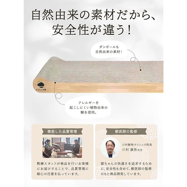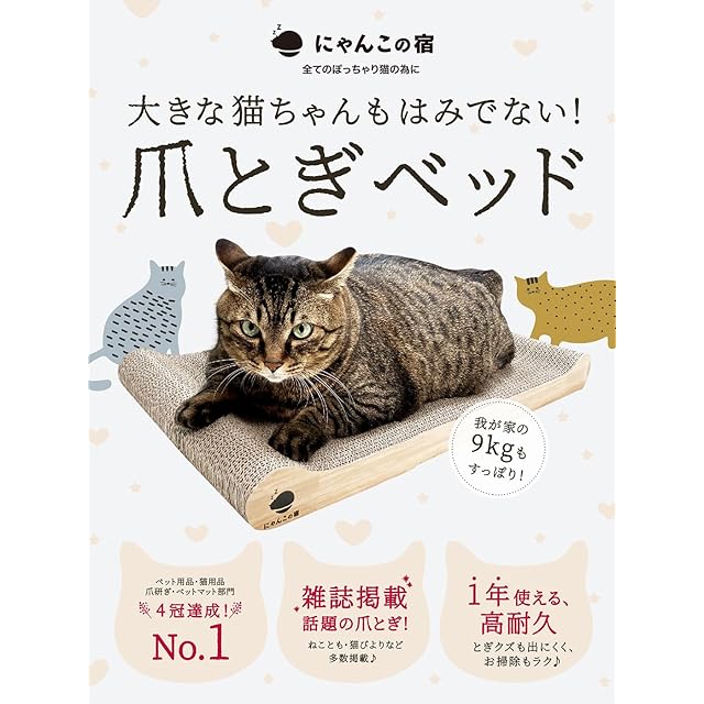 にゃんこの宿とは にゃんこの宿は博多・天神がある福岡県発の大きなネコちゃん専門ブランドです。 にゃんこの宿創設者の飼っている猫が大きいぽっちゃり猫だったため、既存の製品では使い勝手が悪くなんとかこの子にぴったりの商品を作りたいというところからスタートしました。 そして大きな猫ちゃんでもストレスなく、宿に泊まったようにリラックスしてほしいことからにゃんこの宿と名付けました。大きいネコちゃんにとって心地よい存在になれることを願っております。 にゃんこの宿はそういった想いを込めてお客様のもとにお届けしております。 今後ともにゃんこの宿を宜しくお願い致します。 にゃんこの宿 運営責任者 デブ猫の飼い主 商品名:にゃんと極楽 デブ猫 ぽっちゃり猫の為の爪とぎベッド 極楽にいるような安心感に包まれて猫ちゃんにゆったりしてほしいことから「にゃんと極楽」と名付けました。 【もうはみ出さない】6kg以上の大きな猫ちゃんでも収まりゆったり横になれます。 【自然素材なので安心】原料100%紙でこだわりの段ボール。段ボールの接着には植物由来の糊を使用。自然素材なので安心。手や肉球をなめても心配がないよう、ダンボールを貼り合わせる際に使用している糊は、とうもろこしを主原料とした天然素材の糊を使用 【猫ちゃんのからだにフィット】どちらの面も絶妙な角度のカーブで猫のやわらかいからだにフィットします。 【ベッドと爪とぎの2WAY】ベッドとして、つめとぎとしてもご利用いただけます。 【安定性ばっちり】大きな猫ちゃんが爪とぎをしても動かないので安定性ばっちりでストレスの解消が出来ます。 段ボールの接着には植物由来の糊を使用。自然素材なので安心。手や肉球をなめても心配がないよう、ダンボールを貼り合わせる際に使用している糊は、とうもろこしを主原料とした天然素材の糊を使用しています。毛づくろいのために、カラダを舐めても、自然素材なので安心