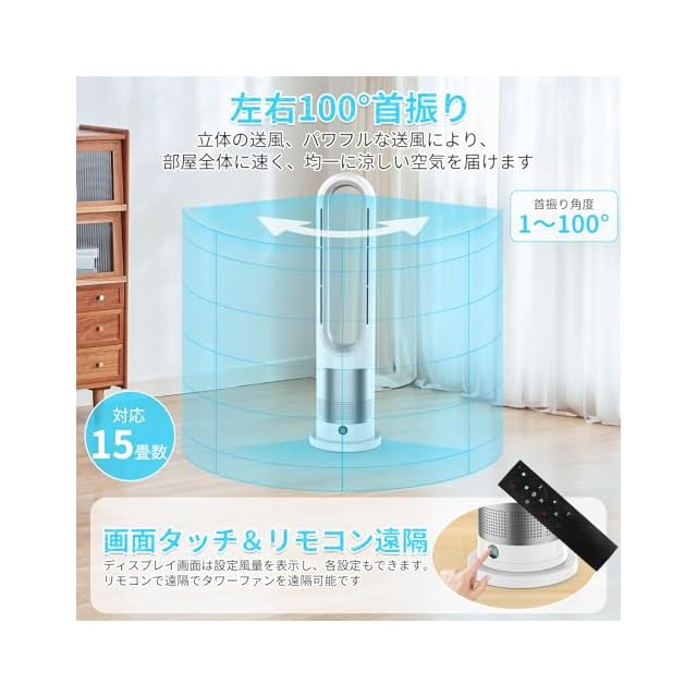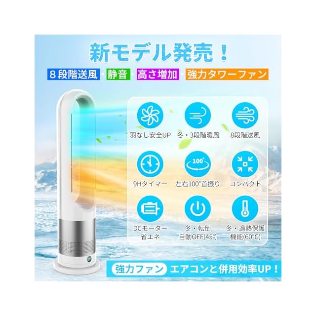 商品名:Fyzuf タワーファン 扇風機【2025新登場&羽根なし&DCモーター電気代節約】羽なし扇風機 冷暖両用 リビング扇風機 サーキュレーター DCモーター 静音運転 8段送風&3段温風 大風量 100°左右首振り 9時間切タイマー 省エネ 節電対策 お手入れ簡単 省スペース 組み立て不要 安全機能搭載 リモコン付 部屋 リビング 会議室 室内など対応 PSE認証済 日本語説明書 (ホワイト)