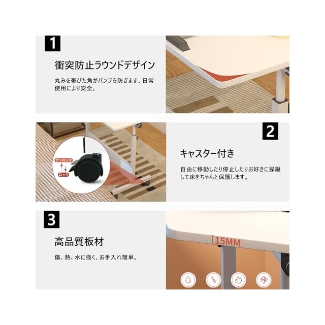 天板角度調整可能:360°幅広い傾く範囲無段階調整可能、使いやすい角度でお使いいただけます。天板を傾けた時にノートパソコンやタブレット、雑誌などが落ちないようにストッパーが付いています。使用しない時は天板を折り畳みむことで圧迫感がなく収納しておけます。