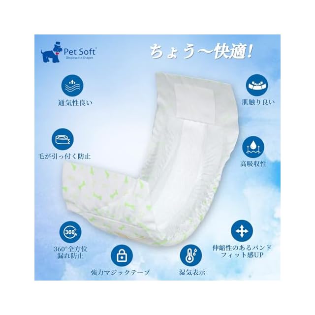 製品仕様:XS、S、Mの3つのサイズからお選びいただけます、ご購入前、必ずサイズ表で愛犬のサイズを確認してください、XS本体1枚のサイズ:約42x17.5x0.3cm、吸収部分約20x8cm、対応胴回り:約15-33cm、S本体1枚のサイズ:約53×20×0.3cm、吸収部分約20x10cm、対応胴回り:約30-48cm、M本体1枚のサイズ:約65×20×0.3cm、吸収部分約:20x10cm、対応胴回り:約45-63cm、マジックテープ式なので、固定用のマジックテープは大きくて、愛犬に適切なサイズに調整できます、伸縮性の縁で、わんちゃんの動きにもピッタリフィットします