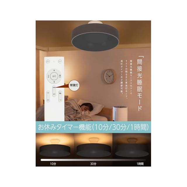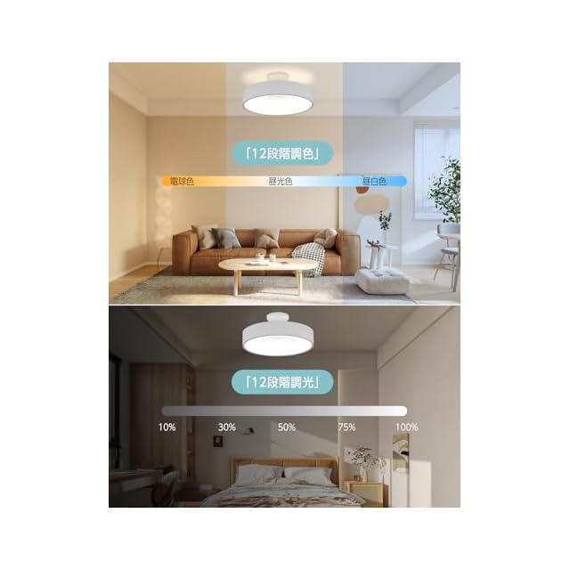 【12段階調光調色・お休みタイマー】2800Kから6500Kまで幅広い色温度の調整が可能で、昼白色から暖色まで、好みに合わせて雰囲気を変えられます。12段階の明るさ調整機能も搭載し、読書や作業、就寝前など、あらゆる場面に最適な光を提供します。また、15分・30分・60分のタイマー設定が可能で、就寝前に便利な省エネ機能も装備されています。