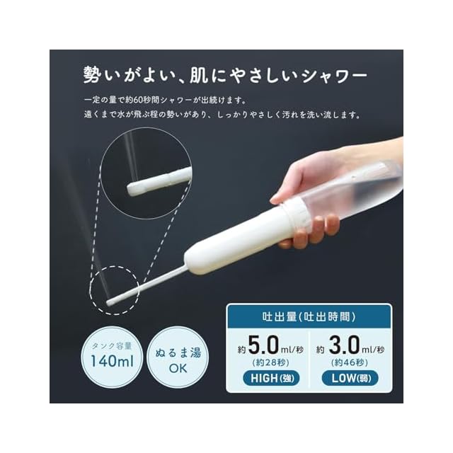 トイレでこっそりと使いたい方もハンドバッグなどに入れて持ち運べるおしり洗浄器。使いたいときに組み立てて、使い終わったらコンパクトに収納しておけるからちょっと使いに便利。使用できる水量はたっぷり140ml。1回の洗浄に十分な容量です。