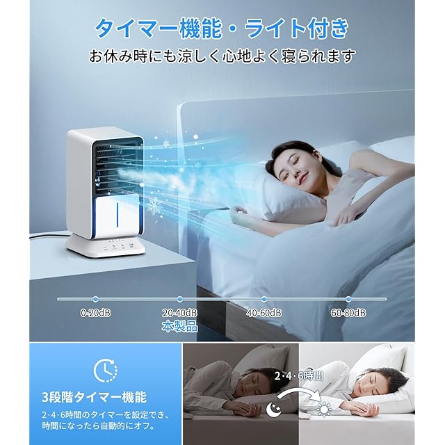 ❄【タイマー付き&ライト付き】2・4・6時間と三段階の切タイマーが設定でき、就寝時の使用にも安心な卓上冷風機です。時間になったら自動電源オフになり、切り忘れの心配がなく、朝まで寝苦しさで目覚めず快適に眠れ、体の冷えすぎ対策や電気の無駄遣い防止にも役立ちます。自然風のような心地よい涼しさと静かさで、睡眠や読書、作業に妨げることはありません。きれいな青いライトも搭載、闇が怖い方にはナイトライトとしてもよいです。消灯したい場合はミストスイッチを約2秒を長押ししたらオフできます。