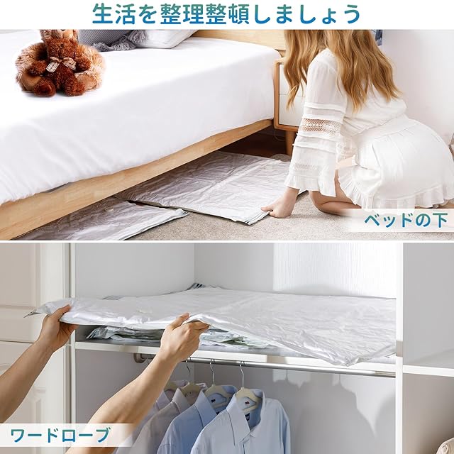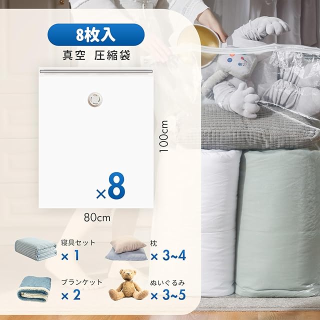 スペースの節約:サイズ:80 100 cm(8 枚) 真空圧縮袋は家庭の保管問題の解決に最適です。真空圧縮技術により、衣類、寝具、掛け布団、毛布、ぬいぐるみ、枕などをしっかりと圧縮することができます。 収納スペースを節約し、ワードローブやスーツケースをより整理整頓します