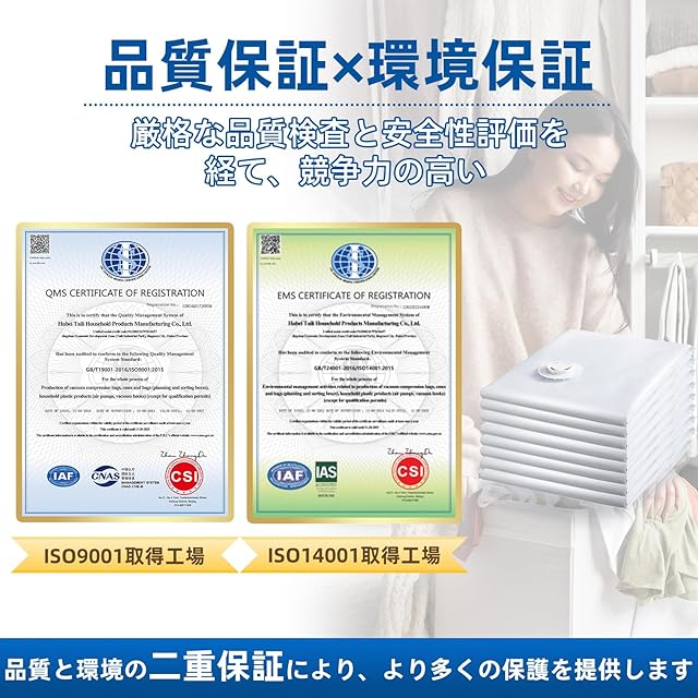 高品質素材:TAILIの真空圧縮袋は耐久性のある素材で作られており、長期間破損したり漏れたりしません。虫やダニなどの害虫の侵入を気にせず、季節の衣類や寝具を安心して保管できます。同時に、TAILIのデザインは湿気に対しても効果的で、衣類や家庭用品をカビや湿気から保護し、アイテムをより長持ちさせ、より乾燥した状態に保ちます