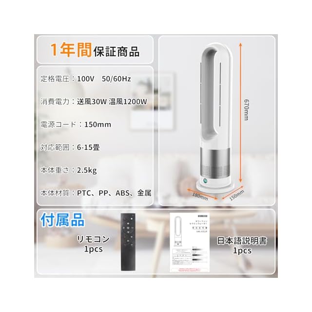 商品名:【 2025新進化・冷暖兼用・DCモーター 】タワーファン 羽なし扇風機 タワーファン温風 冷風 8段階送風/3段階温風 100°左右首振り 9Hタイマー リビング扇風機 強風&微風&静音モード 大風量 熱中症対策 羽根なし リモコン付 省エネ 節電 転倒&過熱OFF 足元 セラミックヒーター 子供部屋/脱衣所/トイレ/キッチン/寝室/リビンク/書斎/ペット用 PSE認証済 日本説明書 ホワイト