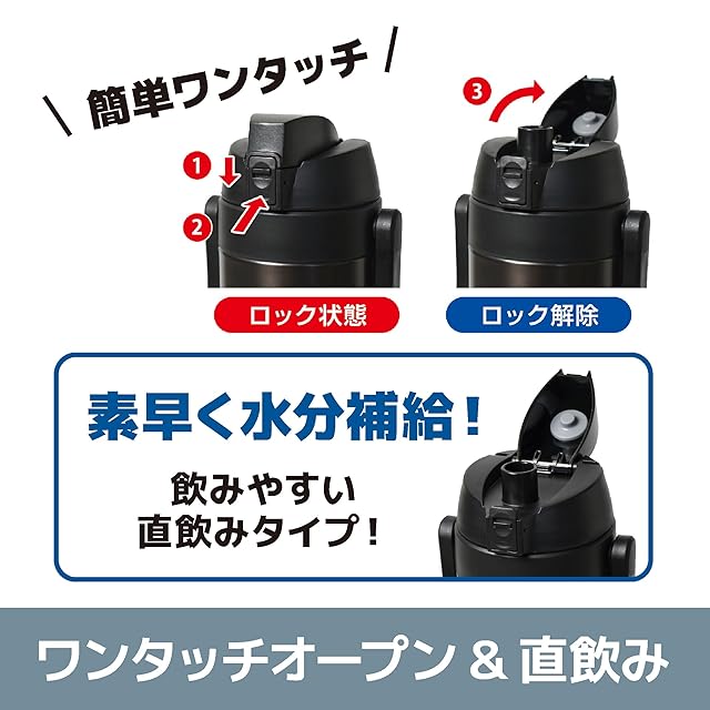 ロック式で持ち運び安心。ワンタッチオープン式ですぐに飲めるダイレクトな飲み口。