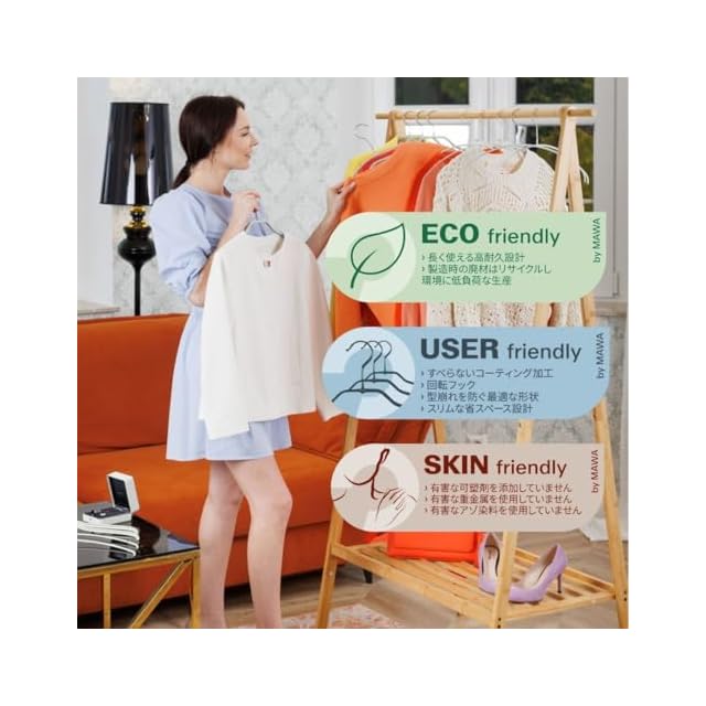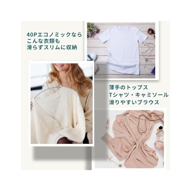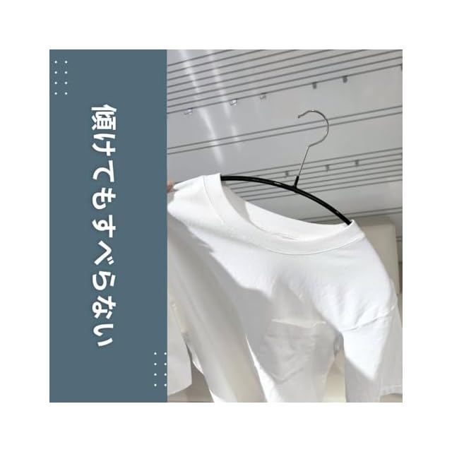 【すべらない】スチール製のハンガー本体はPVC樹脂で特殊コーティングが施され、掛けた衣類が滑り落ちません。人体のラインに合わせた立体構造のため、滑り落ちやすいカーディガンやニットも型崩れなく収納できます。