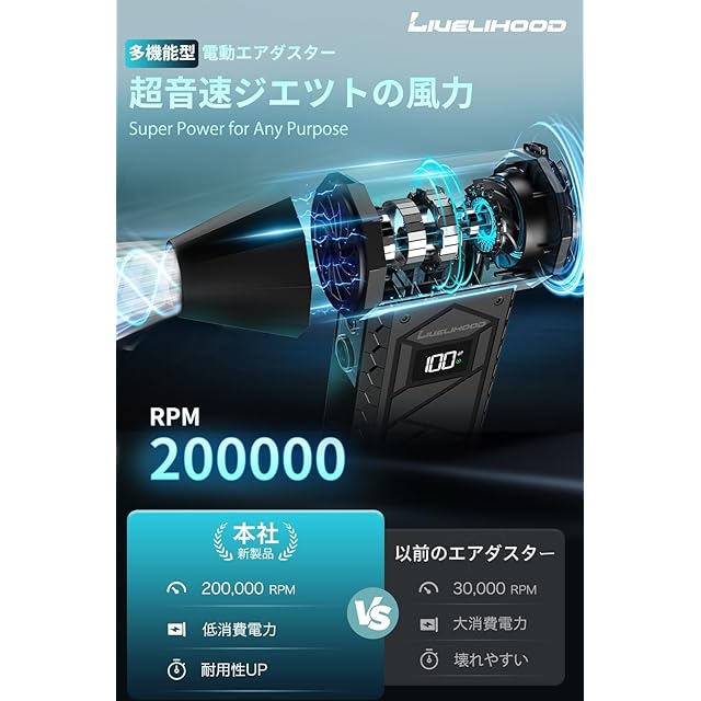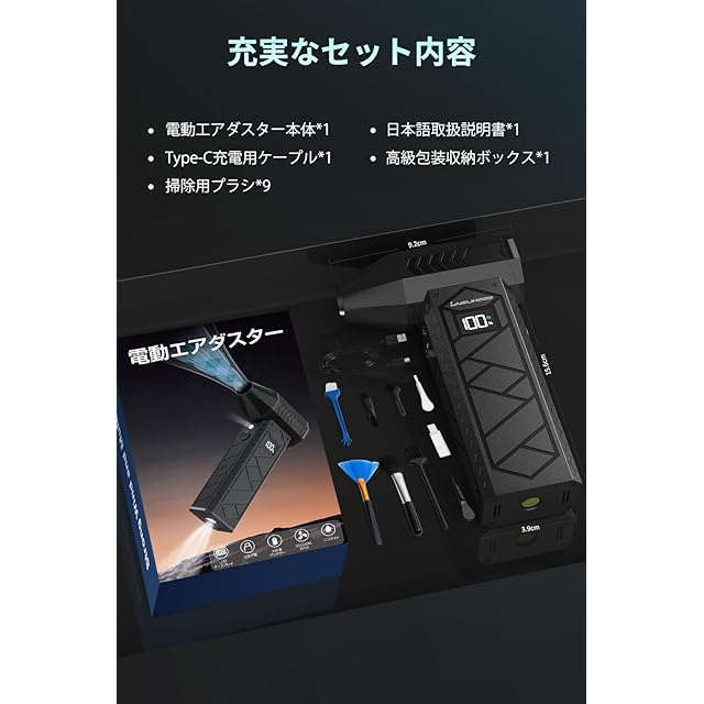 商品名:Livelihood エアダスター 電動【101m/s圧倒的な風速】ブロワー 洗車 200,000RPM高速回転 4段階風量調整 20,000mAhバッテリー 2つライト コードレス Type-C充電式 小型 ブラシレスモーター 過熱保護 コードレス 清潔ブラシ9枚付き 日本語取扱説明書 PC掃除/洗車/キーボード/車内/エアコン照明/防災 (ブラック)