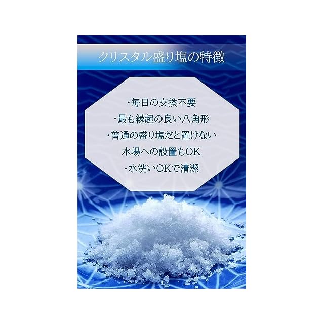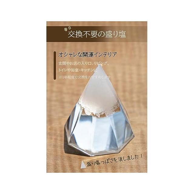 毎日交換不要の盛り塩です。おしゃれで美しい開運インテリアです。 置く場所を選ばない、シンプルでモダンなインテリアとしてもお使いいただけます。普通の盛り塩だと置けない水場への設置も可能です。水洗いもできますので、清潔にご使用いただけます。 天然の粗塩とヒマラヤ岩塩を使用しております。海と山の塩を使うことで盛り塩としての効果をより一層期待できます。 古来より塩には強力な浄化の力があるとされ、魔よけとして使用されてきました。塩は厄除けになるだけでなく、開運と千客万来の守護として古くから習慣がありました。 最も縁起の良いとされる八角形の盛り塩です。ご自宅用はもちろん、お店、ギフトにもお使いいただけます。 ※表面へ塩の成分が粉状に出てくる場合がございますが、本物の天然塩の味わいとしてお楽しみください。気になる場合は、表面を布などで軽く拭いてください。 ※1年程度での交換をおすすめします。 ※先端がとがっていますので取り扱いにご注意ください。