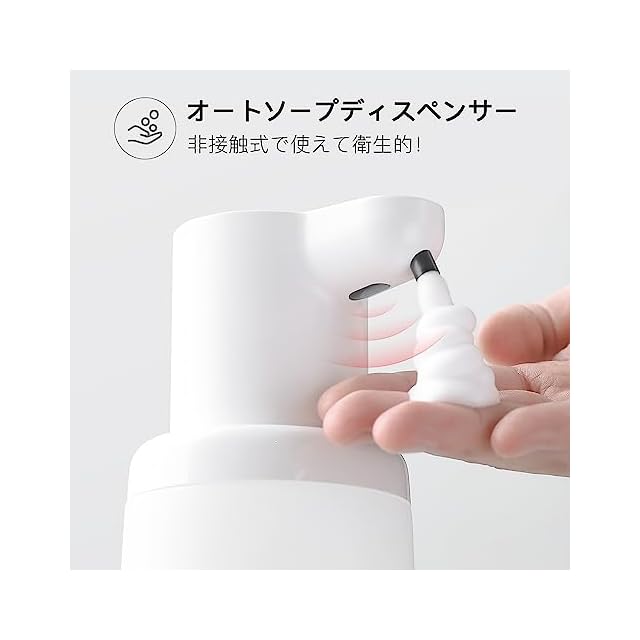 「衛生的に手洗いができる」:自動 ソープディスペンサーは、手をかざすだけで自動的に泡が出るため、手を濡らすことなく衛生的に手洗いができます。きめ細やかなモチモチの泡が出て、汚れをしっかりと落とせるので、毎日の手洗いや食器洗いが快適になります。