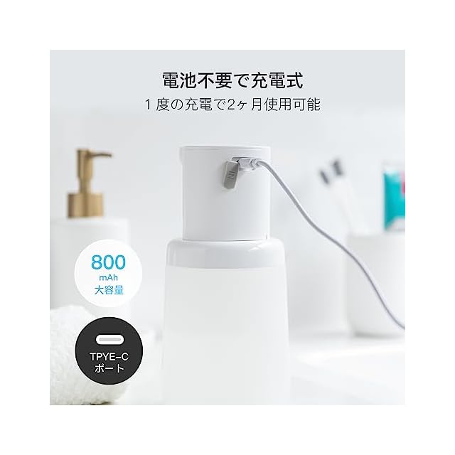 「type-c充電式・IPX5防水」:このオートソープディスペンサーは充電式で、電池の交換が不要です。3時間の充電で約2か月の使用が可能です。IPX5防水性能があるため、洗面台やキッチンはもちろん、お風呂場でも安心して使えます。