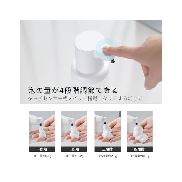 「4段階の泡量調節が可能」:小さな手のお子様から大人まで個人の好みや手の汚れ具合に合わせて、ハンドソープ ディスペンサーの泡の量を4段階で調節することができます。ソープの使い過ぎを防げたり、2回手をかざす必要がなく、便利です。