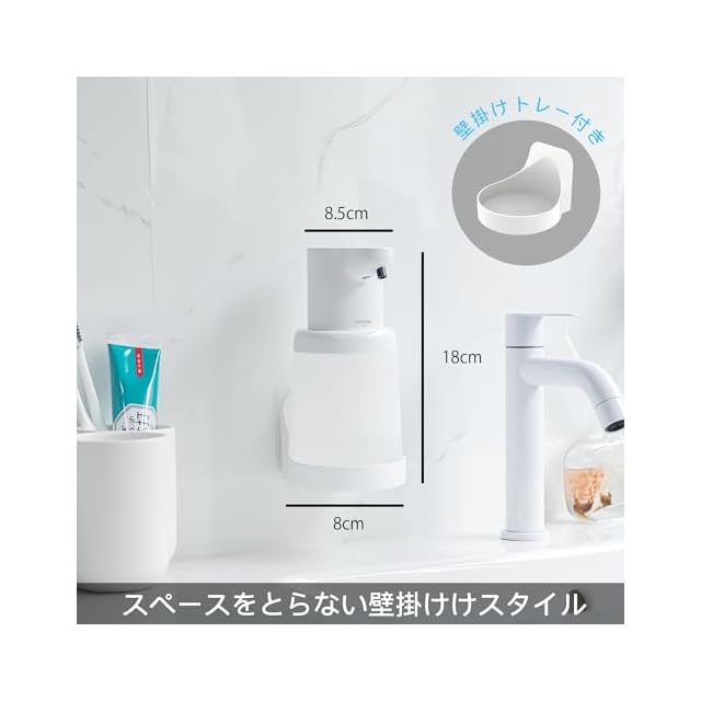 「壁掛け可能」:壁に掛けることができるため、場所を取らず、コンパクトなデザインが魅力的です。ソープディスペンサーやその周りが水浸しにならず、洗面台を清潔に保つことができます。