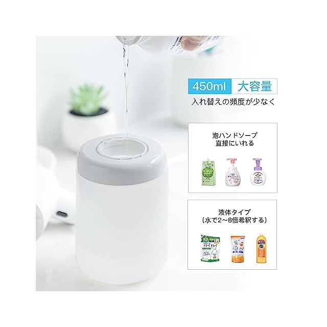 「450ml大容量・詰め替え簡単」:大容量の450ml透明タンクを搭載しているため、頻繁に補充する必要がありません。透明ボトルなので、液体石鹸の残量がひと目でわかります。泡ハンドソープはもちろん、食器用洗剤を2~6倍の水で薄めれば使用できます。