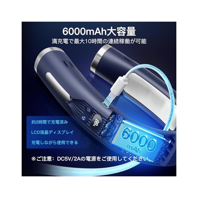 [フィット感&6000mAh大容量]首掛け部には柔軟性のあるシリコン素材を採用し、着脱しやすくなっていますし、女性から男性まで、あらゆる体型の人に合わせた首周りのサイズの調整も実現できます。さらに、大容量の6000mAhバッテリーを搭載し、約2時間で充電済み、満充電で最大10時間の連続稼働が可能です。そして、風量を最大にして体を涼しく確保ことができ、長時間の使用でも安心して使えます。
