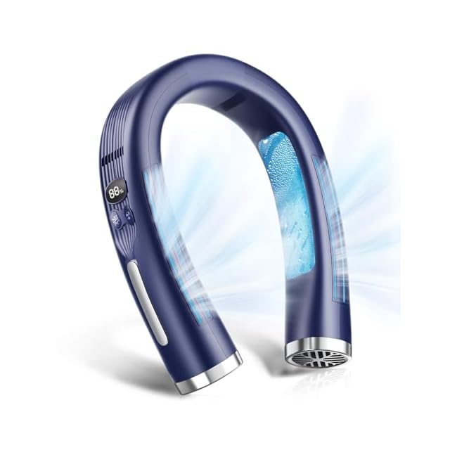 首掛け扇風機 ネッククーラー 一秒冷却【2025年夏新型 冷感首掛けファン ダブル半導体冷却プレート】3段階風量&冷感&温感調節 ハンディクーラー 羽根なし 6000mAh大容量 Type-c充電 角度調節可能 静音 節電 省エネ 携帯扇風機 持ち運び LCD液晶ディスプレイ 熱中症対策/夏用品/屋外作業/父の日/母の日/誕生日/プレゼント (青)