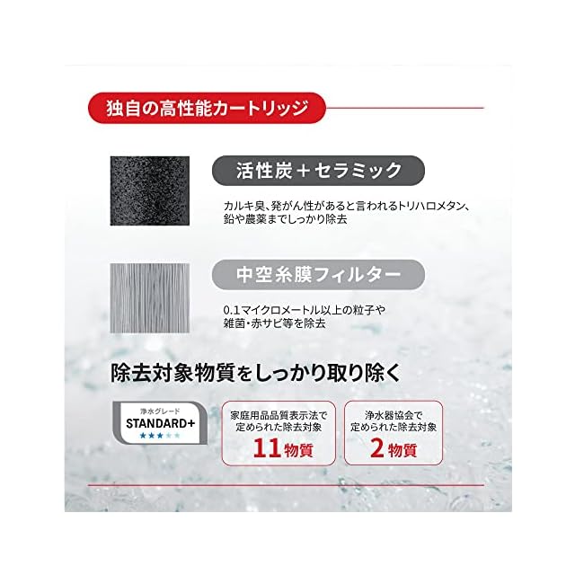 【気になる11+2物質を高度除去】JIS S 3201家庭用浄水器試験方法に定められた除去対象物質のうち11物質と浄水器協会で定められた除去対象物質2物質を 高度除去。気になるトリハロメタンも高度除去します。