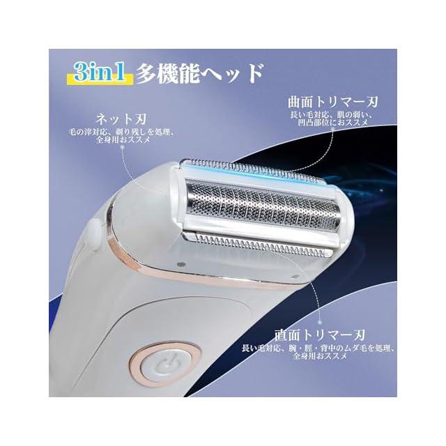 【究極の多機能性・3in1全身対応】レディースシェーバーが3in1ヘッドを設計されて、トリマー刃、弧トリマー刃、ネット刃を一つのヘッドにして、お悩みのムダ毛をこれ1本できれいに剃れます。それぞれ長い毛、剃りにくいところ(脇等)と短い毛(剃り残し)に対応できて、スムーズな剃り心地を実現!広範囲に剃る女性用電気かみそりは、脇、手、足、ビキニ、vio処理などに効果的に対応できます。毎日のケアがこれ1台で完了。美しさへの追求は細部に宿る。