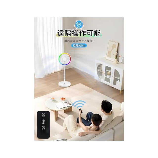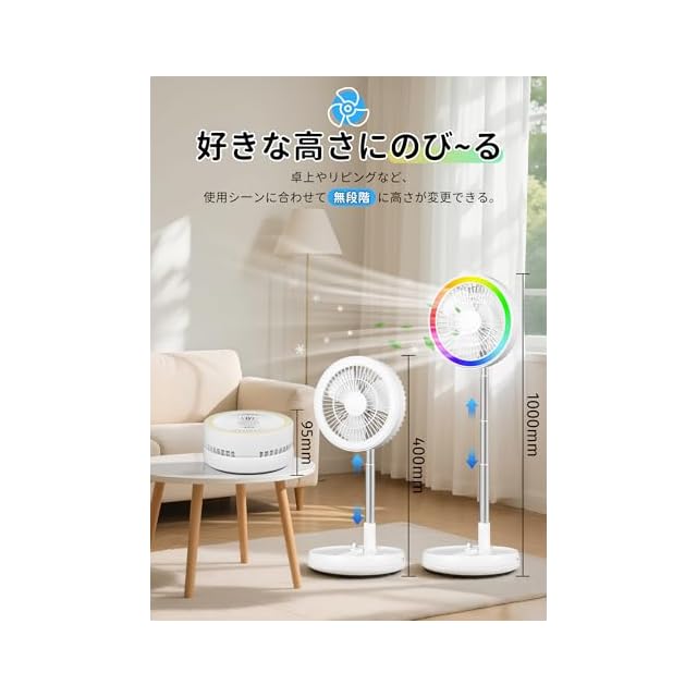 商品名:【2025節電対策・7200mAh電池・12色ライト】コードレス扇風機 折りたたみ dcモーター 扇風機 375-1000mm伸縮式 静音 リビング 卓上 usb充電式 リモコン付き 4段階風量調節 高さ無段階調節 小型 コンパクト収納 省エネ 強力 キャンプ/アウトド/宅内/オフィス/車の中/洗面所に適用 熱中症対策 (白い)