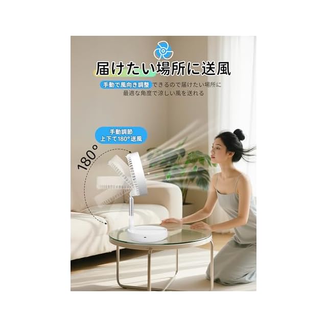 【折りたたみ&伸縮式扇風機でマルチシーン対応】1台で5役!卓上・リビング・携帯扇風機・サーキュレーター・ナイトライトの多機能扇風機が登場!伸縮式ポールで高さは37.5cm~100cmまで自由自在!ソファに座りながらも、デスクワーク中も、お好みの高さで顔にしっかり風を届けます。最大の魅力は驚きのコンパクトさ!折りたたむとわずか約20.3×9.5cmの薄型サイズと重さも約1kgの軽量でバッグにもスッキリ収納&持ち運び楽々。充電式なのでコードの煩わしさゼロ!リビングやオフィスの床置きはもちろん、折りたためば卓上でも活躍。コンパクト収納で場所を取らず、アウトドアのキャンプにも最適な、真に場所を選ばない扇風機です。