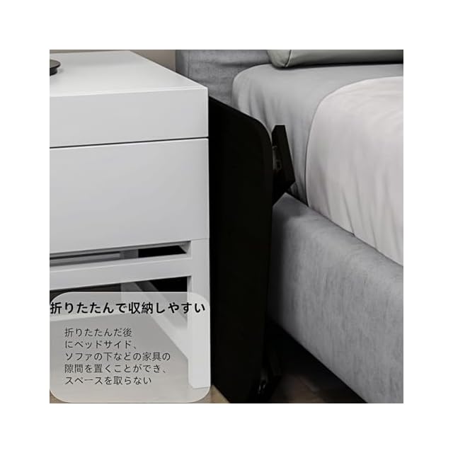 & 省スペース,ロックを押して外したら、内側へ倒せば楽にたためます。折りたたむと高さ6cmになるので、使わない時は折り畳んでソファやベッドの下などちょっとした隙間に収納できます,コンパクトに収納できる。
