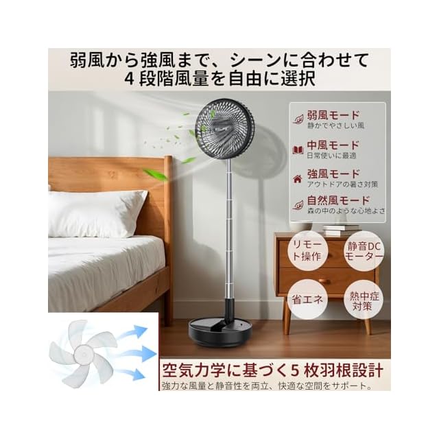 4段階風量&静音設計:弱~強風まで4段階調節可能。ブラシレス静音DCモーター搭載で就寝時の騒音はわずか30dB以下(※弱風時)。寝室用扇風機としても、集中力が必要なオフィス作業時も邪魔になりません。