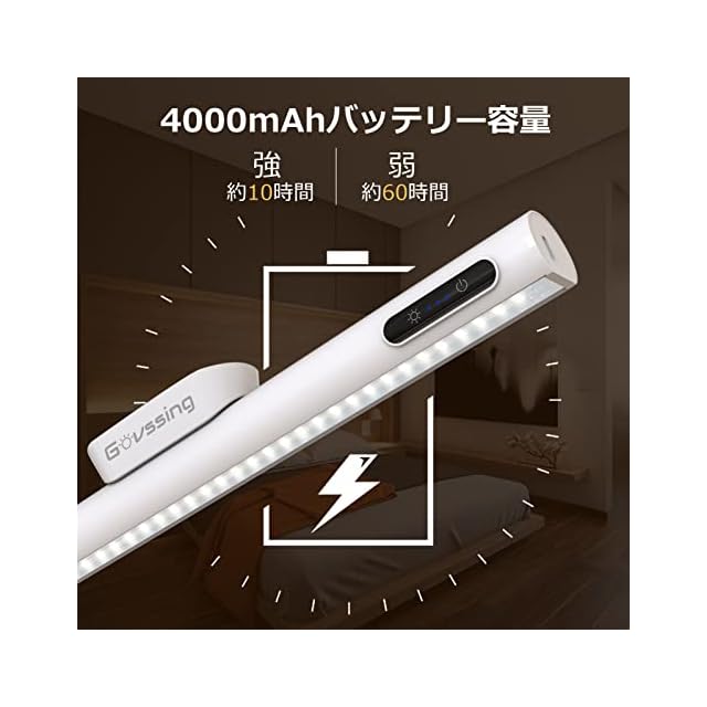 商品名:デスクライト Govssing LEDライト 4000mAh バッテリー残量インジケーターライト付き ネジ取り付けが可能 Type-C充電式 卓上ライト おしゃれ 目に優しい 電気スタンド タッチ式 3種類色温と無段階調光 100度角度調節可能 マグネットとリモコン付き タイミング機能 読書灯 間接照明 壁掛けライト 勉強、ベット、机、車内、化粧鏡などに適用