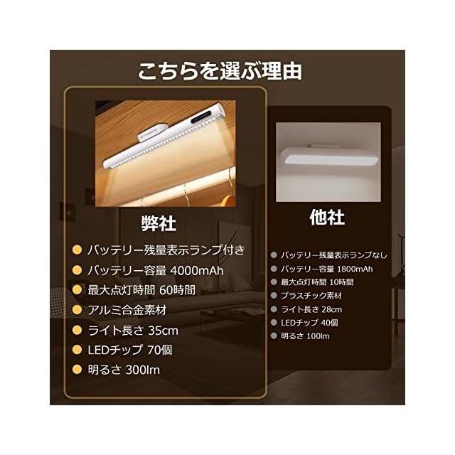 【三つの取り付けた方法・角度調整も可能】:両面テープとネジが付属しており、ランプが落ちることを心配せずに、ネジを使用して凹凸のある表面に取り付けます。 ledライトはマッグネット付き、あらゆる鉄の表面に取り付けることができます。100度まで回転できますので、クローゼット、倉庫や車のトランクなどところで補助照明としても使えます。*使用中、まぶしい光源が直接目に入らないでください。