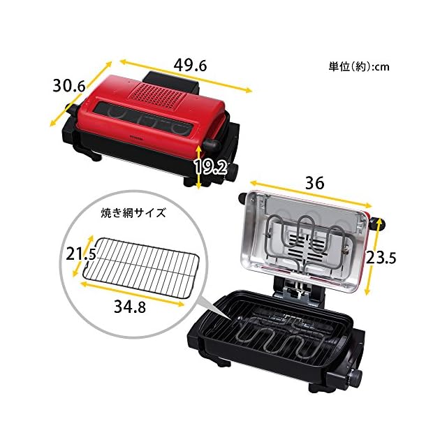焼き網サイズ(cm):幅約34.8×奥行約21.5 コードの長さ:約1.5m 主要材質:ふた/アルミニウム、ガラス窓/耐熱強化ガラス、取っ手・本体/フェノール樹脂、焼き網/ステンレス、水受け皿/スチール