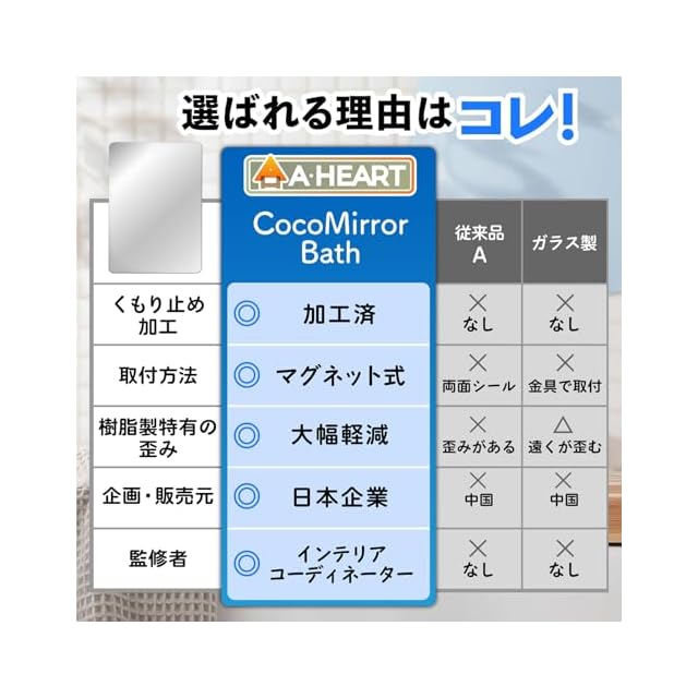 ✅【商品基本仕様】ココミラーCocoMirror購入のお客様の要望におこたえして、浴室専用の割れない鏡、CocoMirror Bath を開発いたしました。1.曇り止め加工、 2.強力マグネット式、3.こだわりの映像、4.割れない、5.ハードコート加工(汚れ・傷防止)の特徴があります。※曇り止め加工をしていますが全くもらないわけではありません。曇った際は水をかけてください。
