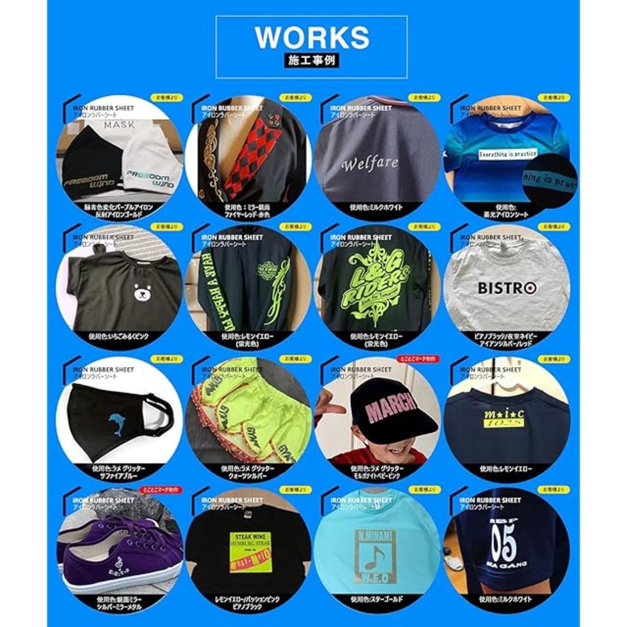 【サイズがぴったりサイズではございません。少し長めにカットします。】綿やポリエステル素材を推奨しますが、確実な接着をするものではありません。※生地の種類や状態によっては、接着できない場合があります。必ず事前にテストを行ってからご使用ください。※撥水加工など特殊加工が施された生地や、熱に弱い生地にはご使用できません。・色や種類によって、若干の厚みや質感の違いがあるため、同じカット設定では切れない場合があります。必ずテストカットを行ってからご使用ください。またプレス時間や剥がすタイミングも、色や種類によって異なる場合があります。事前にテストを行ってからご使用ください。 ■使用方法 1)予めデザインが完成したものをカットする道具が必要です。はさみ、カッター、カット板、(お持ちの方はカッティングマシーン)などご用途に合わせてご準備ください。熱転写するのでシリコンシートもご用意ください。(”シリコン樹脂”のクッキン グシートなどでOK!) 2)予め作っていたモチーフデザインをカットします。転写時反転させますので、カットする際は反転して作成します。光沢がある面が剥離フィルムになります!裏側をカットして下さい! 3)不要部分を剥がします。透明の剥離フィルムに余分な物が付いていないように、しっかりとカス取りします。 4)キレイに取り除いたら、転写するTシャツとともに、デザインしたシートを透明の剥離フィルムが上になるように、アイロン台の上にのせてバランスをとります。 5)デザインしたシートの上にシリコンシートを載せて、アイロンを150℃~160℃ほどで10~20秒ほど、プレス気味に全体にしっかりとあてます。※アイロンによっては凹凸があるものもありますのでご注意ください。しっかりとあたっていないと、貼り付けることができません。※推奨アイロン温度は、150°~160°になります。(アイロンは弱、中、強などの表示となるかと思いますが、お使いのご説明書などやメーカーにてご確認くださいませ) 6)熱いうちに透明の剥離フィルムを剥がします。時折、剥離フィルムにくっつく場合もありますので、ゆっくり様子を見ながらお剥がしください。環境や熱、貼るものにより、熱が冷めてからのほうが剥がしやすいこともございます。[ワンポイントアドバイス] フィルムを剥がした後に貼り付きが悪く少し浮いてしまった場合は、シリコンシートを再度載せ、アイロンをかけてあげると生地にくっつきます。 7)キレイに圧着出来ていたら完成!転写したシートに繊維の凹凸感が出ていたらバッチリです! オリジナルTシャツやパーカー、バック、イベント用品などが簡単に作れる、アイロンシート になります。