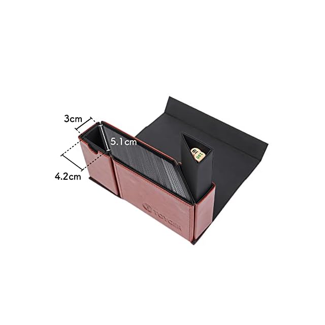 外寸(閉じている時) : 長さ約20.3cm、高さ約10.2cm、厚さ約5.4cm(底面で計測) 収納可能カード(若しくはスリーブ)の最大サイズ : 縦約9.5cm、横約7.4cm