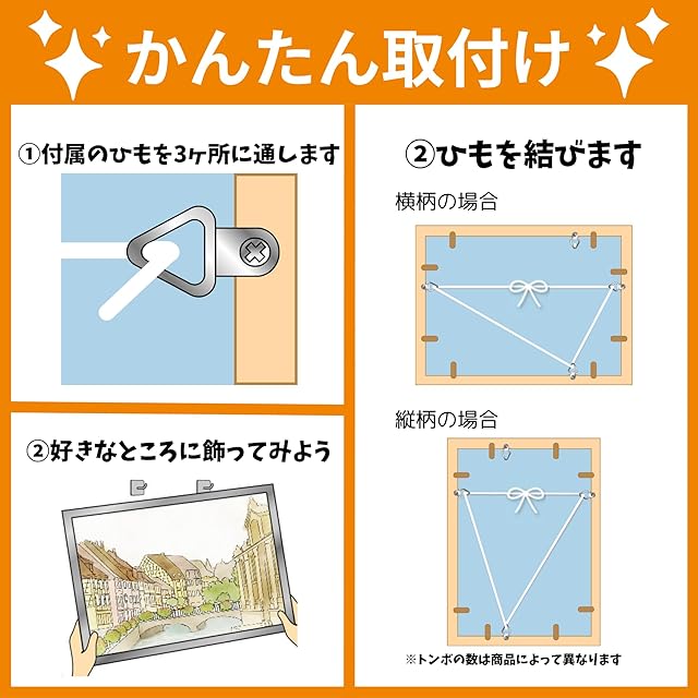 工具不要。壁掛けに便利な紐付き。