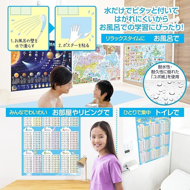 商品名:お風呂の学校 セット価格 地図/インド式かけ算(1-9の段&11-19の段)青空 お風呂ポスター2種類セット 日本製 地理 学習 知育 社会 算数 九九 B3サイズ 防水