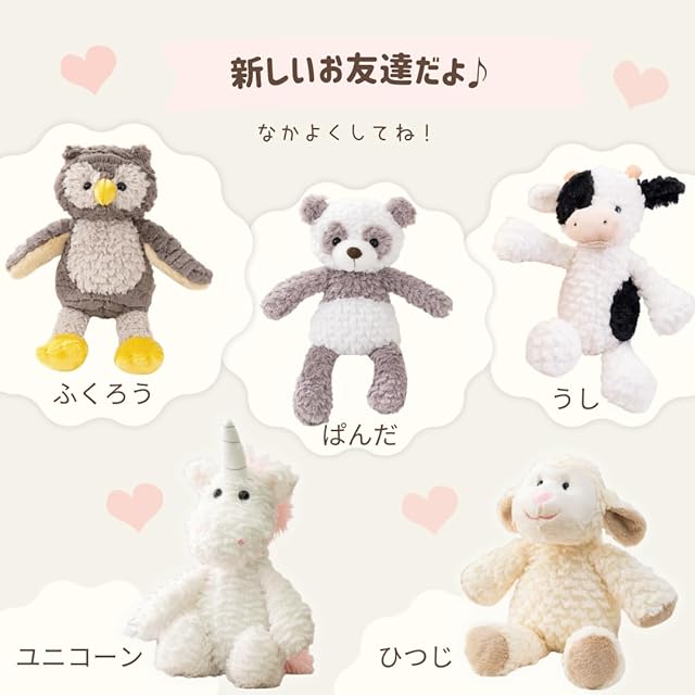 種類:くま、いぬ、ぞう、うさぎホワイト、うさぎピンク、ぱんだ、ユニコーン、うし、ふくろう、ひつじ 大きさ:種類によって異なります。商品ページをご覧ください。