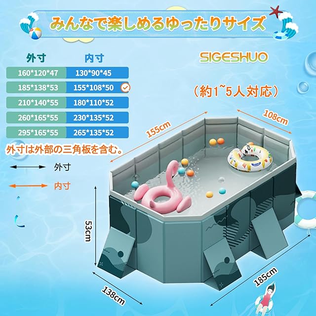 【群抜き耐久性】SIGESHUO プールの材料の厚さは7 mmに達し、空気入りプールの厚さの2倍以上です。極厚設計により、プールの耐久性と耐圧性が向上し、日常的な磨耗や摩擦に耐えるだけでなく、使用中の強い水の衝撃を効果的に防ぐことができます。 厚い素材と優れた耐久性により、プールは何シーズンも使用することができます。