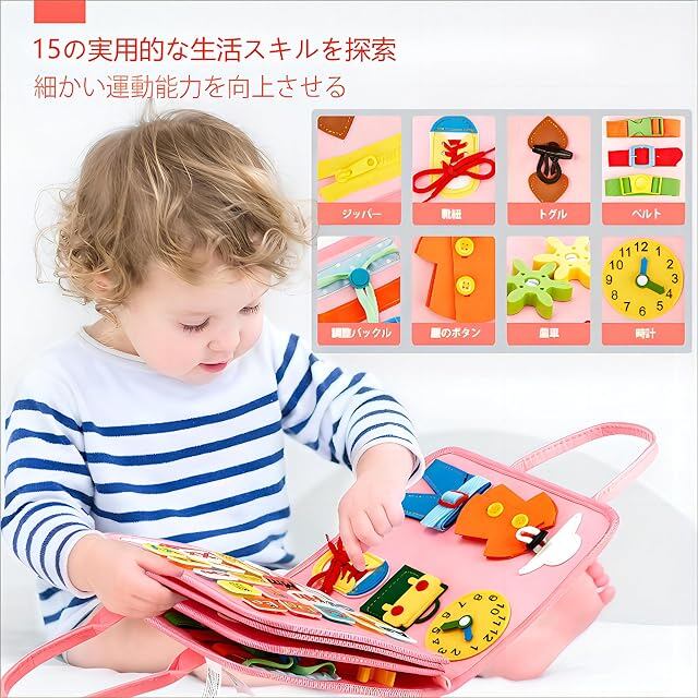 【実用的な生活スキルを学ぶ】この生活スキル学習ボードには、トドラーが着替え、バックルを締め、スナップを留め、ボタンをかけ、ひもを結ぶ方法を教える15の感覚的アクティビティが含まれています。モンテッソーリに触発された実用的な生活スキル、細かい運動スキル、問題解決スキル、論理的思考、手と目の協調性を育むために設計されており、お子様をしばらく楽しませることができます。