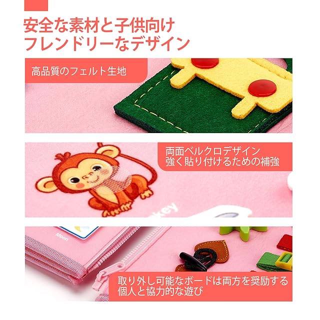 商品名:hahaland モンテッソーリ 布絵本 おもちゃ 男の子 女の子 1/2/3/4/5歳 ビジーボード 知育玩具 動かす 紐通し 靴紐結び ボタン ジッパー 指先 数字 アルファベット 幼児 学習 教育 入園準備 誕生日