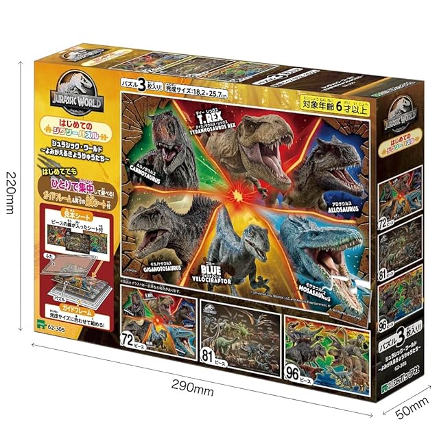 商品名:エポック社 72/81/96ピース こどもパズル ジュラシック・ワールド ~よみがえるきょうりゅうたち~ (18.2×25.7cm) 62-305 3種のパズル 見本シート付 ガイドフレーム付き 3歳以上 おもちゃ EPOCH
