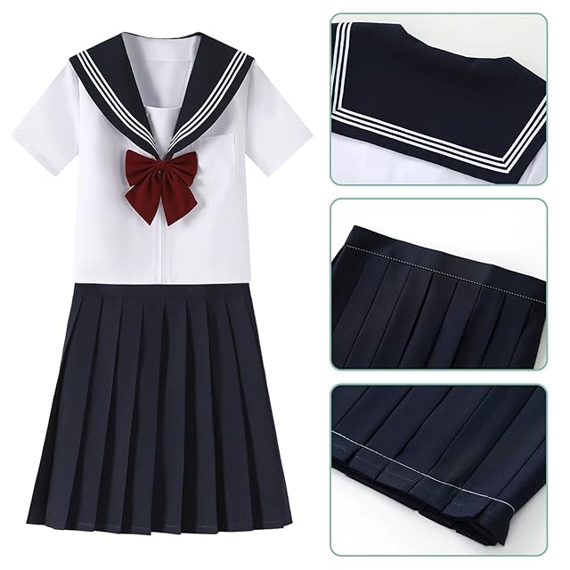 【デザイン】白シャツはゆったりとした短めの丈、プリーツスカートは体型の黄金比を強調するようにデザインされたちょうど良い丈です。セーラー服は白シャツが単調になりすぎないように関西襟と小さなポケットをつけ、プリーツスカートは変形しにくいように高温でアイロンをかけています。 赤いリボンは、ガーリーな雰囲気で可愛らしい視覚効果をプラスしています。 シャツのステッチもきちんと繊細で、色あせしにくいです。