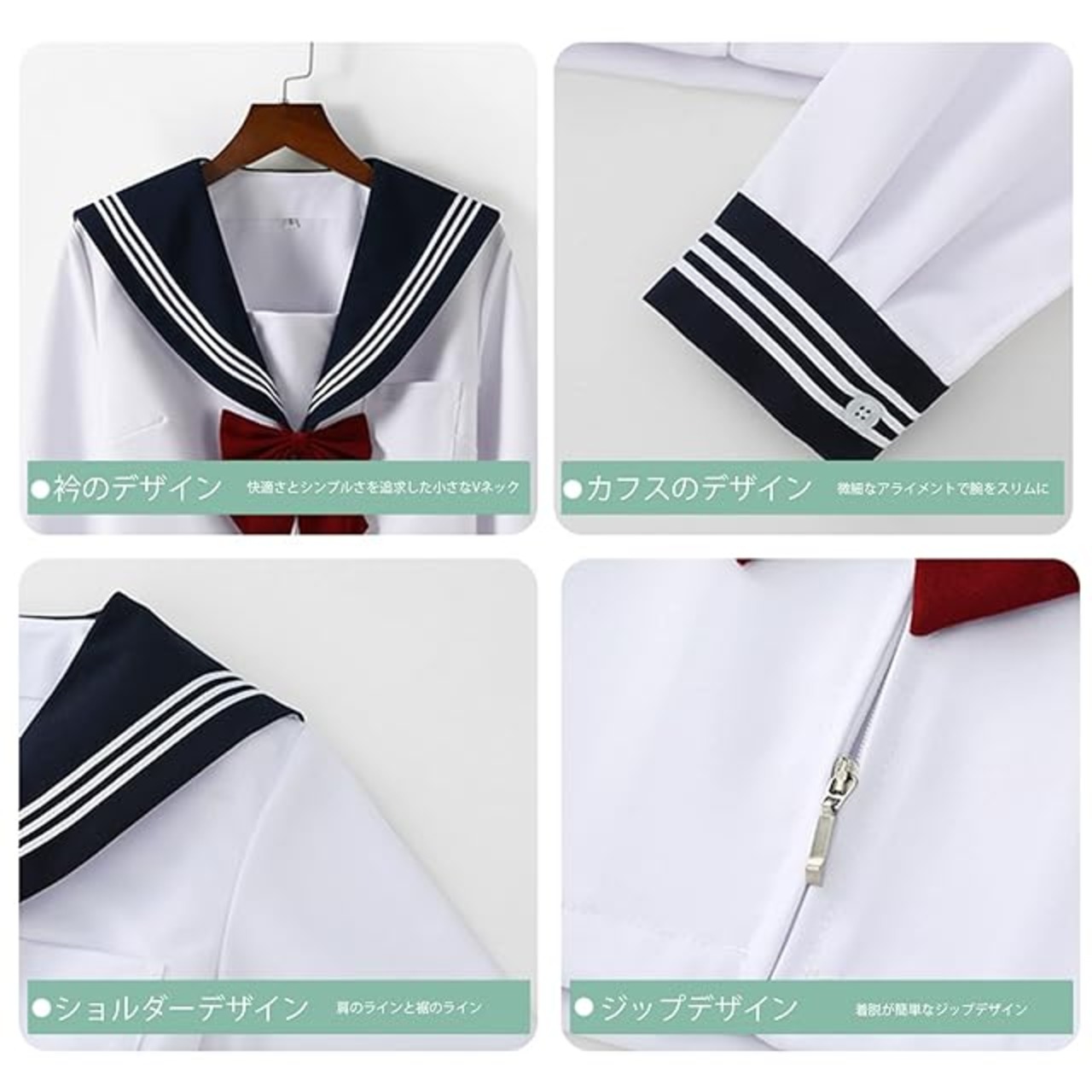 【デザイン】白シャツはゆったりとした短めの丈、プリーツスカートは体型の黄金比を強調するようにデザインされたちょうど良い丈です。セーラー服は白シャツが単調になりすぎないように関西襟と小さなポケットをつけ、プリーツスカートは変形しにくいように高温でアイロンをかけています。 赤いリボンは、ガーリーな雰囲気で可愛らしい視覚効果をプラスしています。 シャツのステッチもきちんと繊細で、色あせしにくいです。