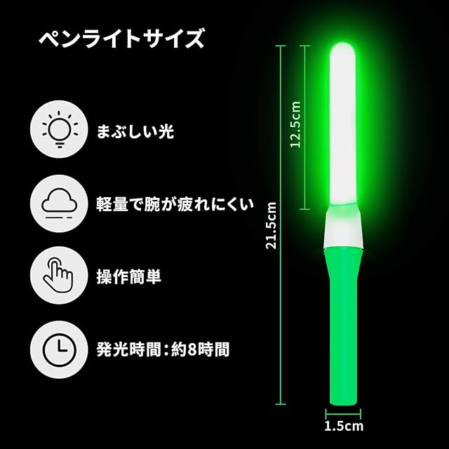 【商品仕様】発光時間:約8時間;セット内容:ペンライト+単5型乾電池+ストラップ+日本語取扱説明書。なお、使い捨てではなく電池で繰り返し使えますので地球にやさしく経済的です!