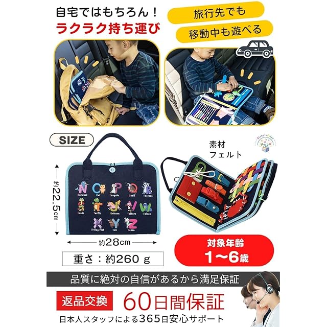 【手先を使う機会が減少した子供たちの指先の訓練に】靴紐を結んだり、ボタンを閉めたり、様々な動作をさせることで、指先の鍛錬になり、また「これは何だろう?」という子どもの探求心を刺激します。22x28cmとコンパクト、また非常に軽い(260g)ので持ち運びに便利です。車の中や機内で遊んだり、どこでも気軽に遊べます。