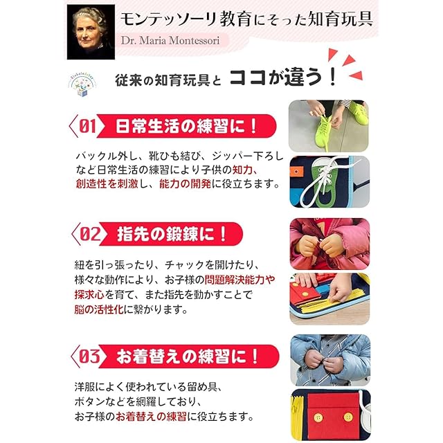 【モンテッソーリ教育】子供たちが自発的に取り組むことができる玩具です。 バックル外し、お着替えの練習や靴ひも結びなど日常生活の練習を実践!また様々な動作を通し、指先の鍛錬をすることは脳の活性化にもつながります。