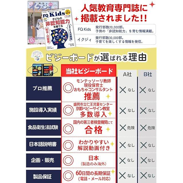 【厚生労働省認定試験合格済み】6歳未満のお子様が使用する場合、厚生労働省の指定する食品衛生法試験は必須ですが、Globaledutoyのビジーボードは当該試験に合格済みです。そのためお子様が万が一舐めてしまっても有害な着色料や塗料は一切使用していないので、安心です。