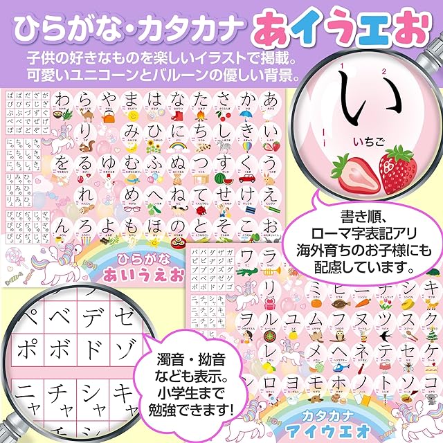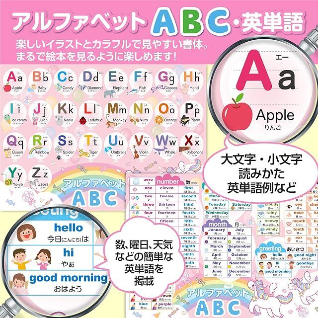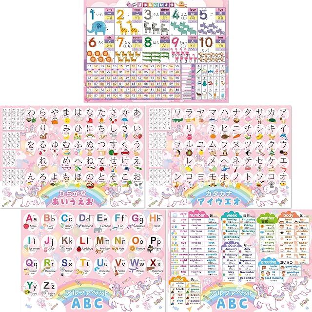 色:すうじのひょう(動物)/ひらがなとカタカナとアルファベット(ユニコーン)お風呂ポスター3種類セット