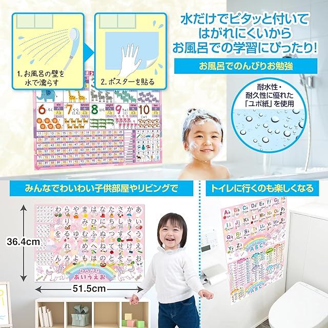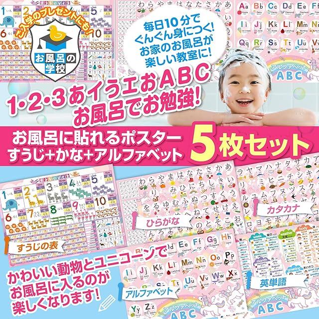 お風呂の学校 セット価格 すうじのひょう(動物)/ひらがなとカタカナとアルファベット(ユニコーン)お風呂ポスター3種類セット 日本製 数字 文字 英語 お受験 学習 知育 B3サイズ 防水 | Trend Design BASE店